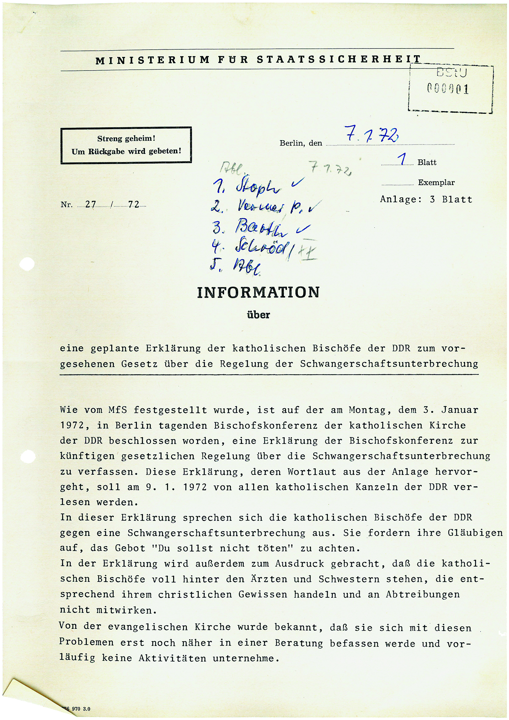 Information Nr. 27/72 über eine geplante Erklärung der katholischen Bischöfe der DDR zum vorgesehenen Gesetz über die Regelung der Schwangerschaftsunterbrechung